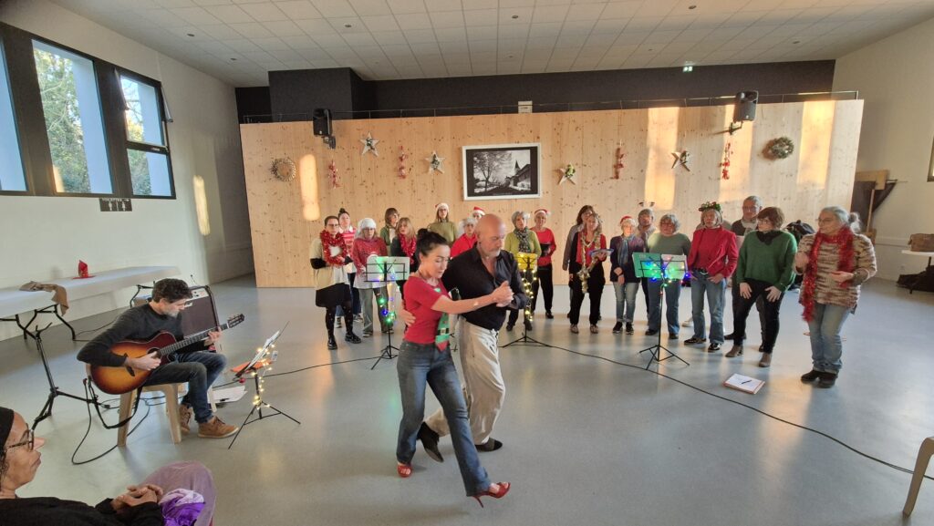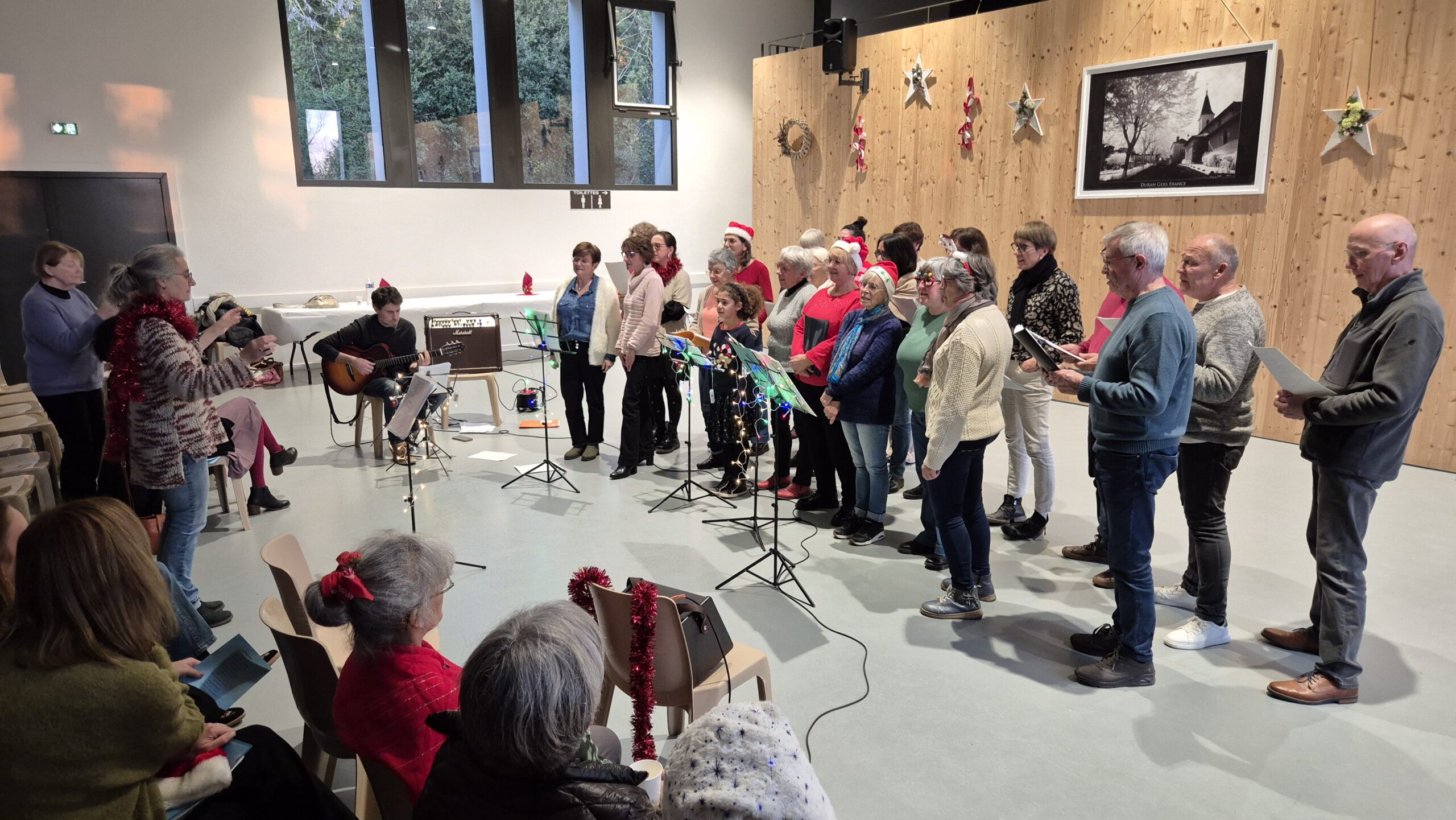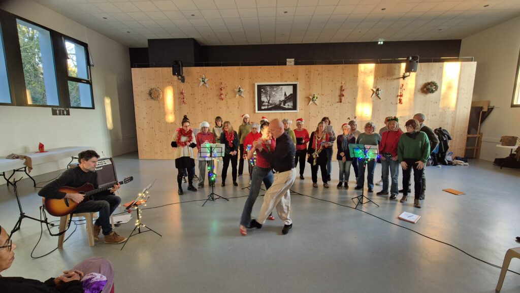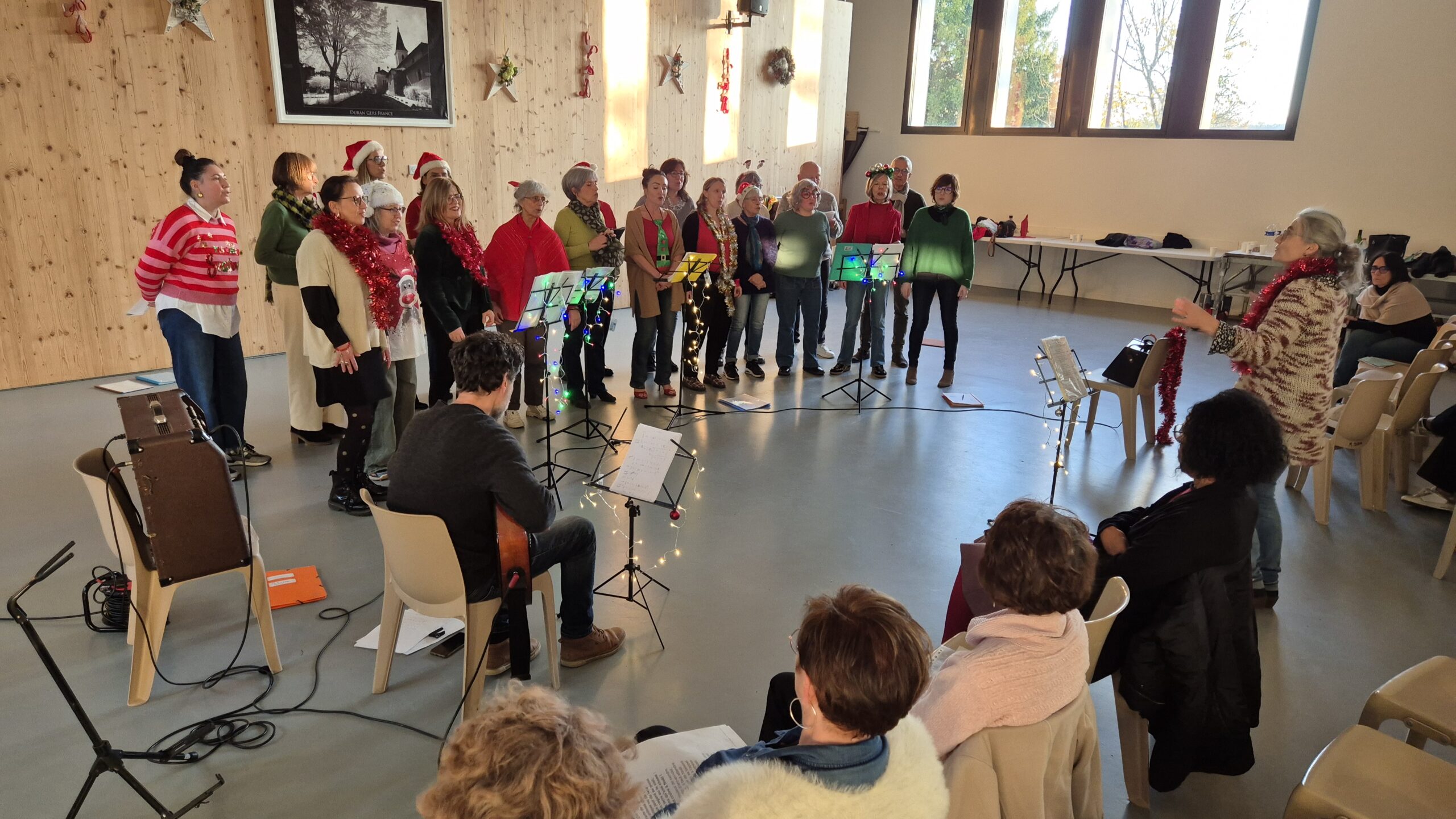 Puis vint un moment très attendu : celui du Chœur Éphémère, formé le matin même par des volontaires des alentours. Guidés par notre cheffe de chœur et accompagnés à la guitare par Stéphane, ils ont offert trois chants traditionnels de Noël, préparés en quelques heures seulement. Leur engagement, leur écoute mutuelle et leur envie de partager ont touché le public en plein cœur.