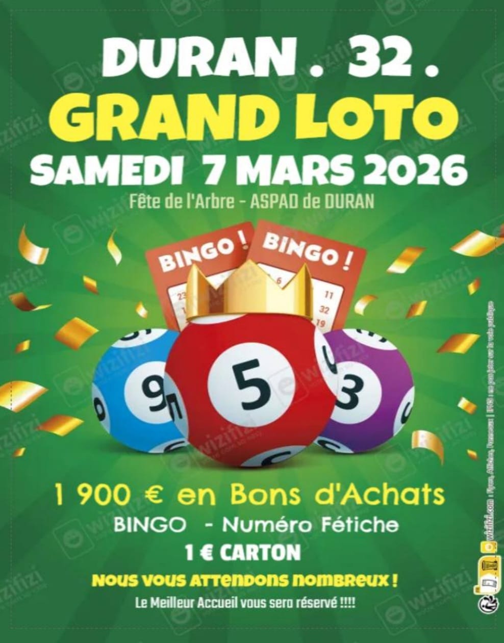 Le prochain loto de l’ASPAD aura lieu le samedi 7 mars à 21h00, à la salle des fêtes de Duran.